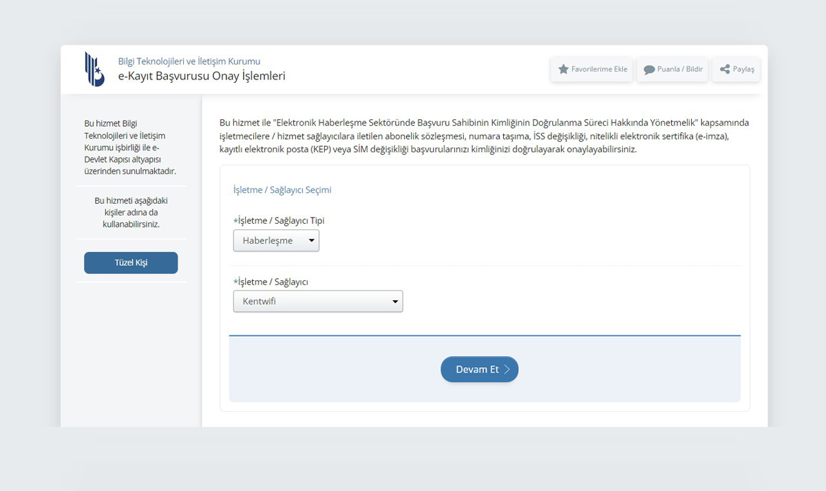 Yönlendirileceğiniz sayfada bulunan İşletme/Sağlayıcı Tipi alanında "Haberleşme" seçeneğini tıklayın. Ardından İşletme/Sağlayıcı alanında "Kentwifi" seçeneğini seçin ve "Devam Et" butonuna tıklayın