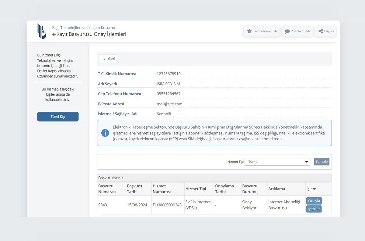 Yönlendirileceğiniz sayfada, yapmış olduğunuz başvurularınızın listelendiği bir ekran görüntülenecektir. Başvurunuzu kontrol edin ve ilgili başvurunun yanında bulunan "Onayla" butonuna tıklayın. Bu adım, başvurunuzun onaylanmadan önce başvuru detayı sayfasına yönlendirecektir.